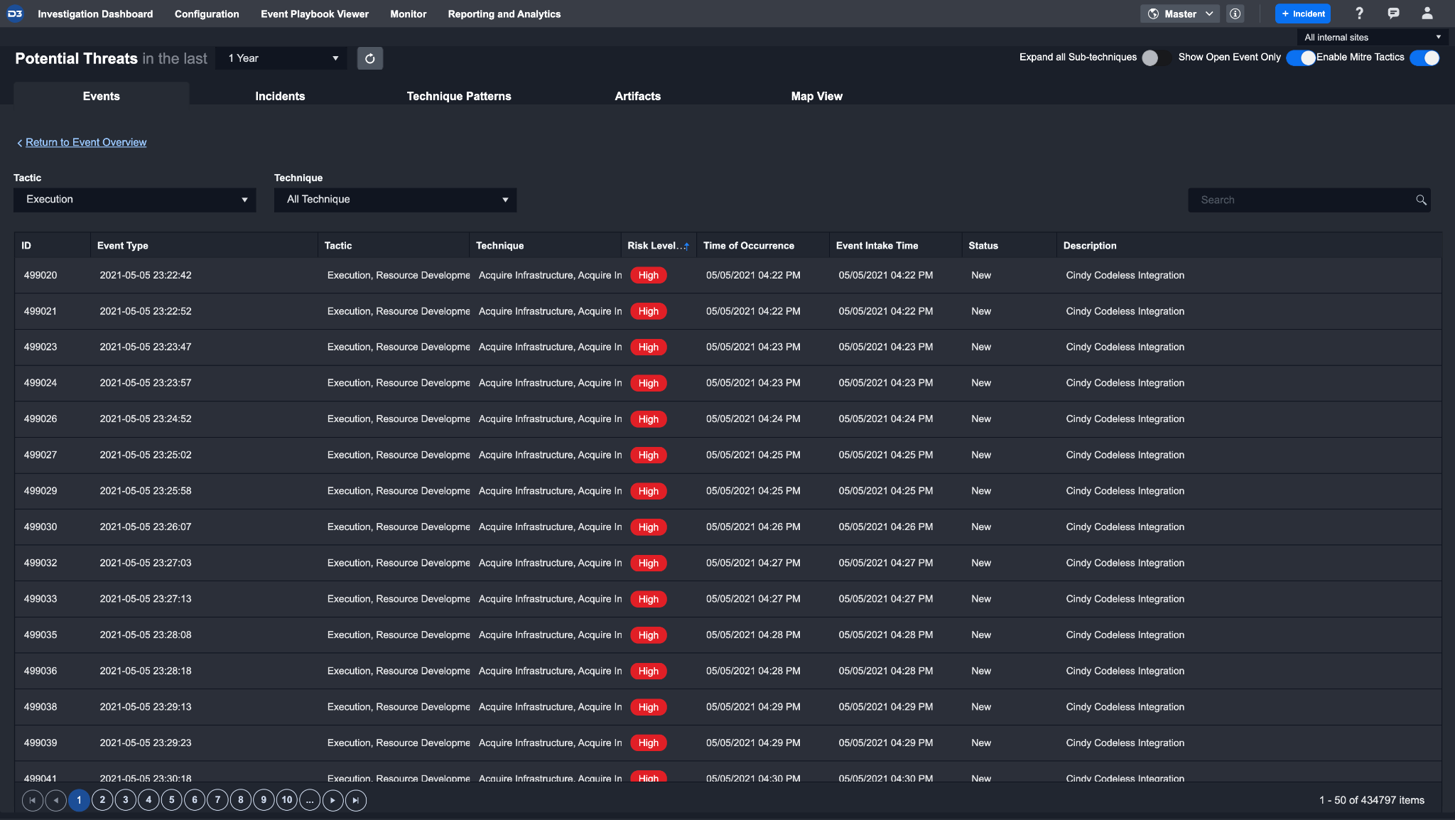 Clicking on a specific Tactic or Technique from the MITRE ATT&CK matrix view will reveal a list of all underlying events. All events in the events list are sorted by their time of occurrence, and the time they were ingested into the SOAR platform. You can select an event to investigate it. Subsequently, you can escalate the event to an incident, or dismiss it.