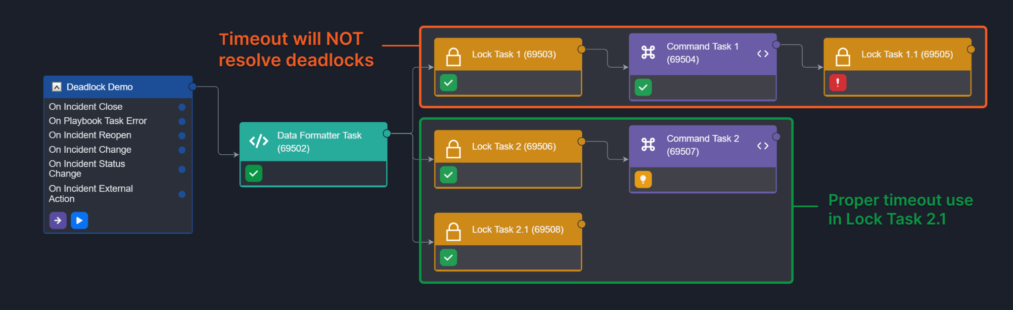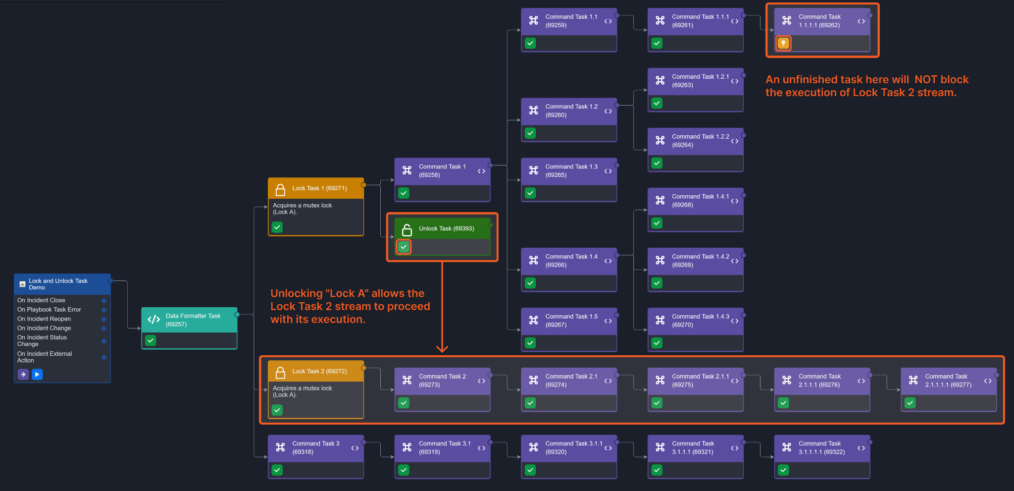 If even one task of the executing Lock Task stream is unfinished during a playbook run, your other Lock Task stream(s) will be blocked.