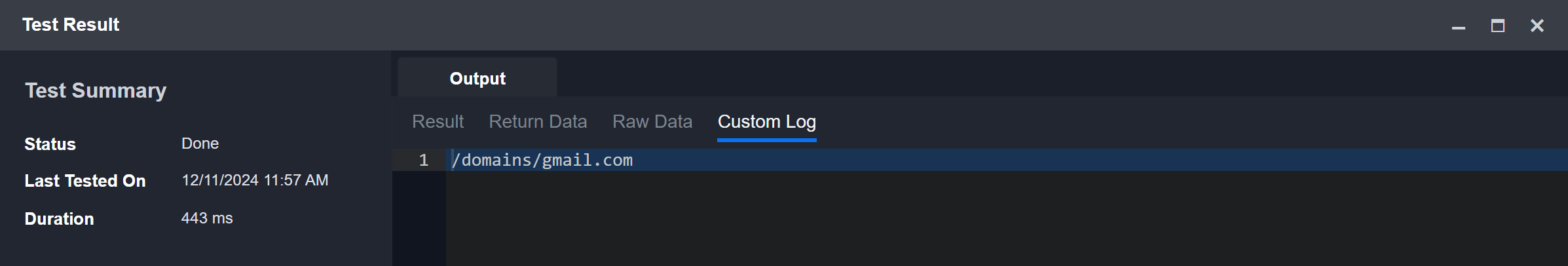 These logs appear in the Test Result popup, under the Custom Log tab.