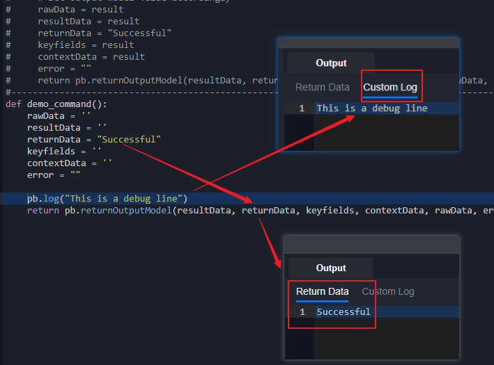 PYruntime.get('connector',{}).get('serverurl','<your default value>')Output data can be separated into result data, return data, raw data, errors log and passdown data, and turn into command output through function `pb.returnOutputModel`. For details, refer to Return Output Model.