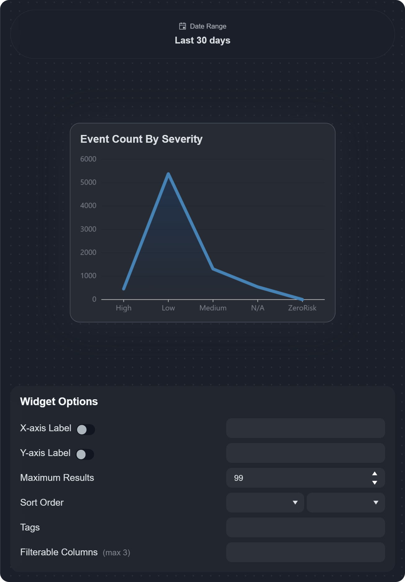 Widgets are visual representations of queries made from one of three system data sources, including Artifact, Event, and Incident. Once widgets are created, they can be added to and displayed in dashboards.