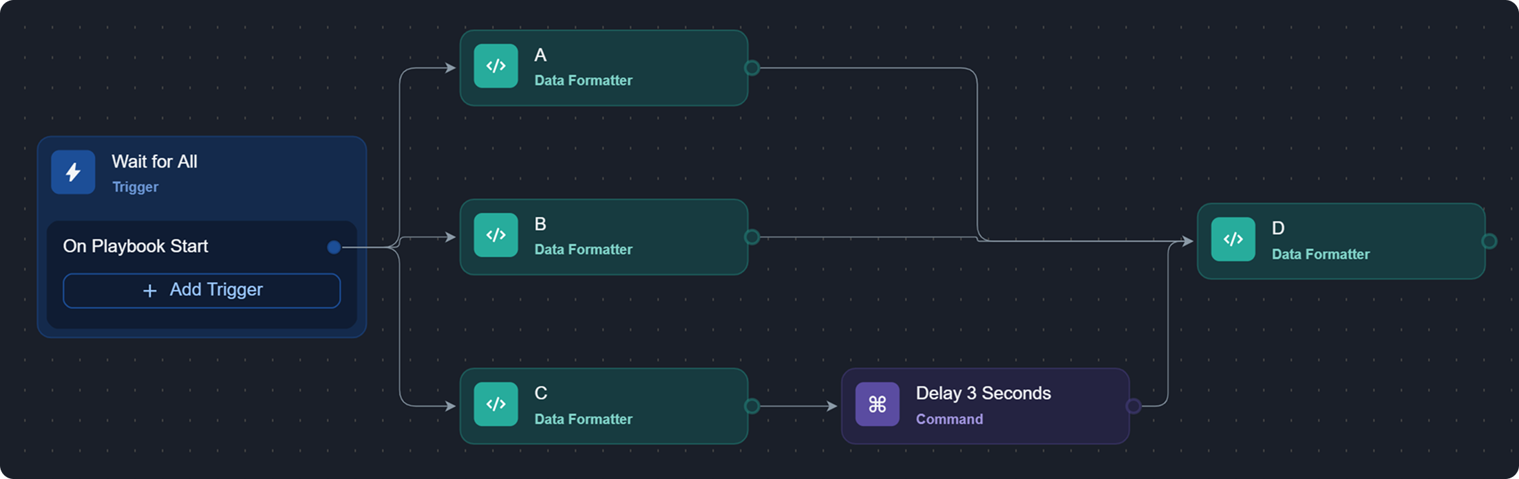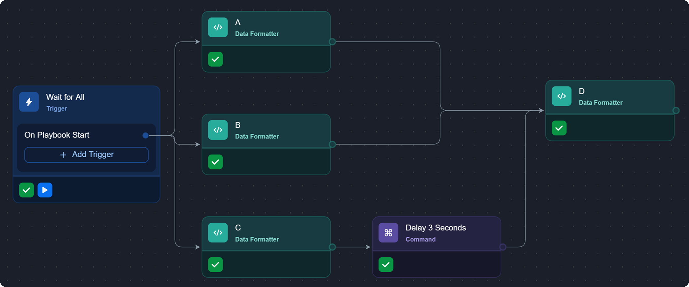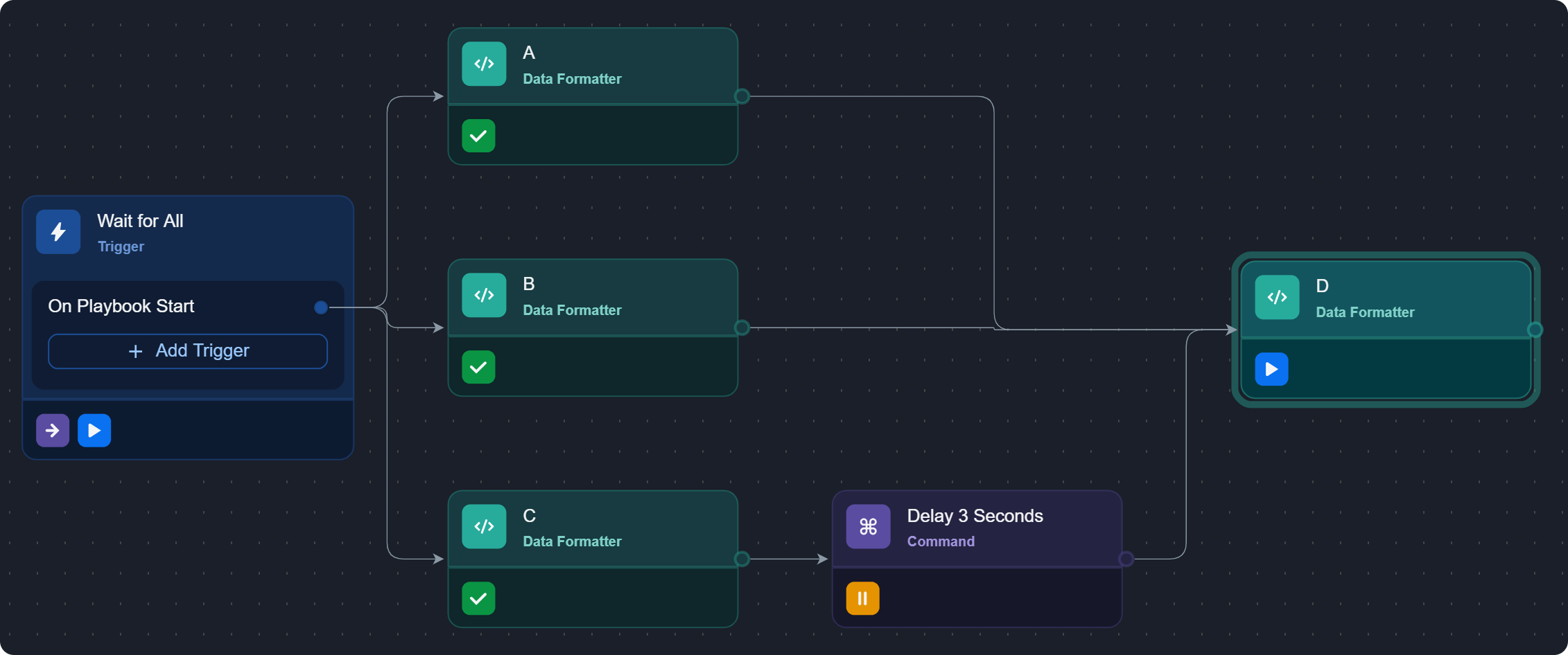 Task D, whose run mode is set to Wait for All, receives convergence from three parallel tasks—A, B, and C—with task C preceding a 3-second delay before joining.