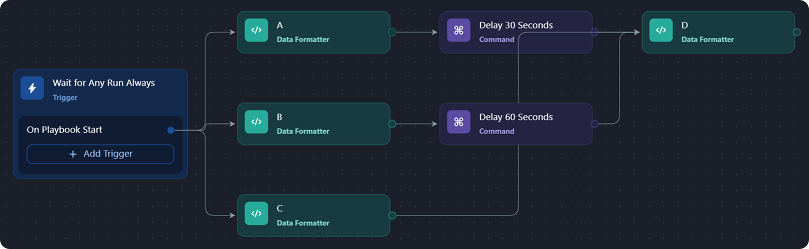 Task D, whose run mode is set to Wait for Any, Run Once, converges from three tasks—A, B, and C. Task A leads with a 30-second delay, while task B follows with a 60-second delay. Task C has no delay. All tasks independently converge at task D.