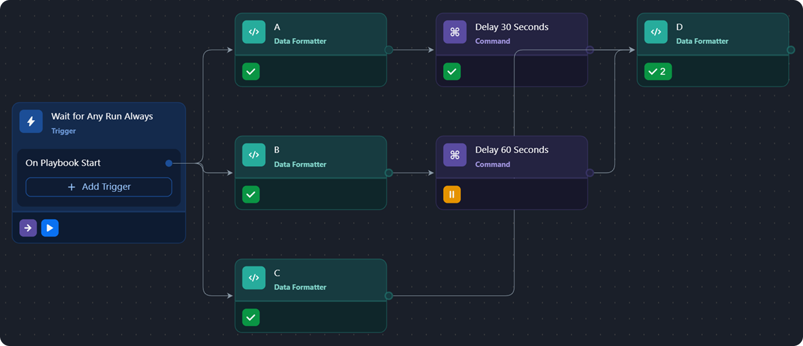 Task D receives parallel input from three tasks—A, B, and C. Task A has a 30-second delay, task B has a 60-second delay, and task C proceeds without delay before all three converge at task D.