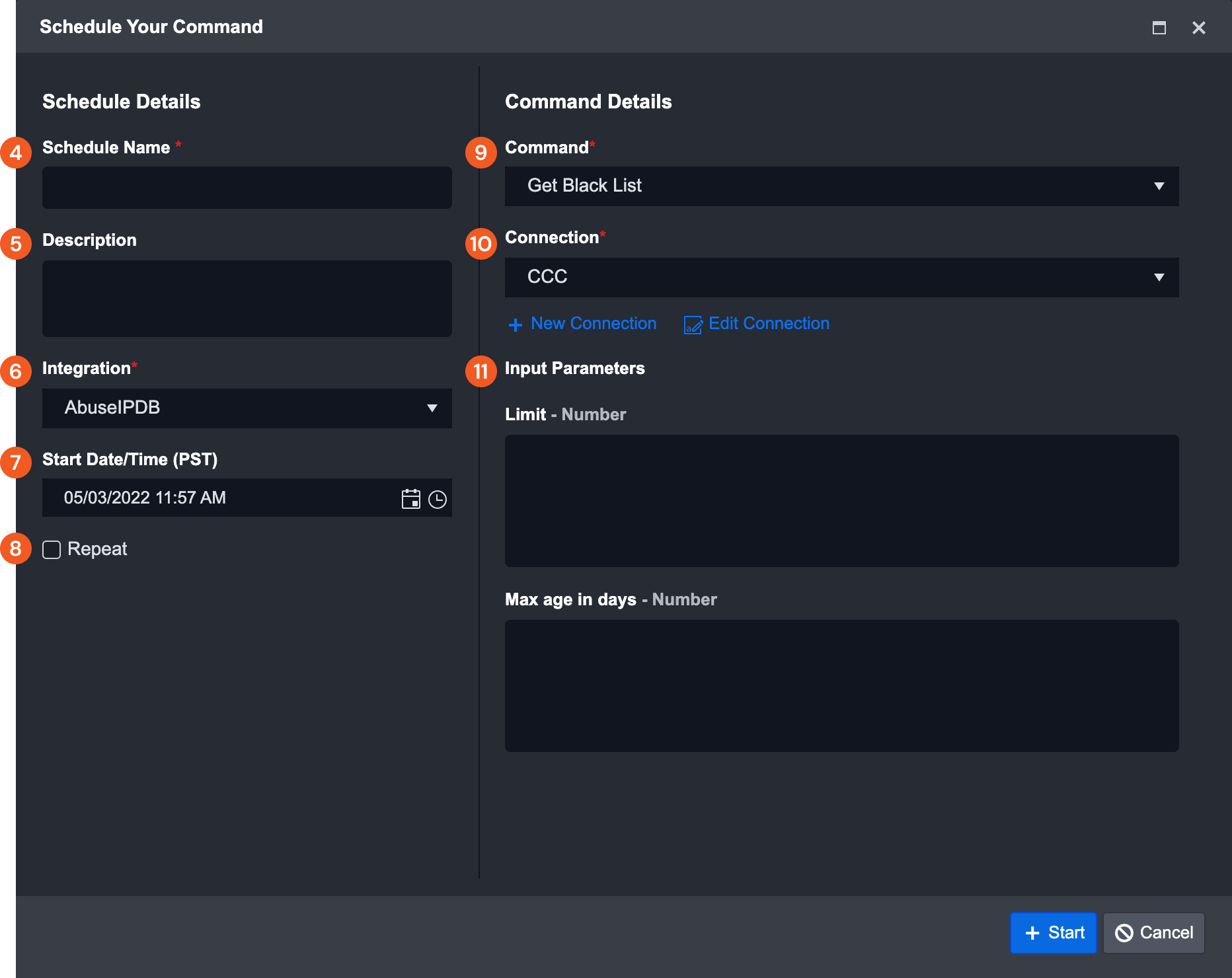 Schedules is a system that executes tasks at defined time intervals. Both utility commands and integration commands can be scheduled to run periodically. For example, the system can be scheduled to perform a weekly IP reputation check on incoming emails or execute any other automated action. All schedules can be created, edited, and viewed within the Schedules module.