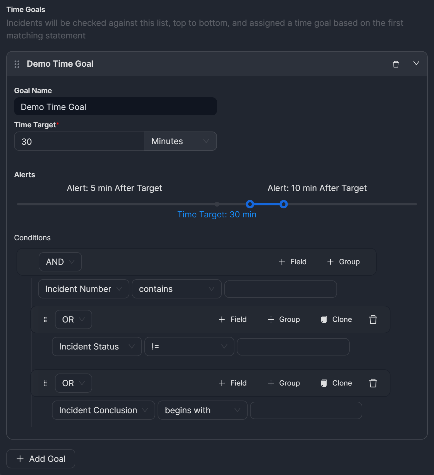 Conditions: The criteria used to match incidents to this time goal.