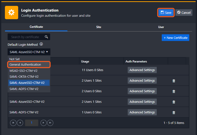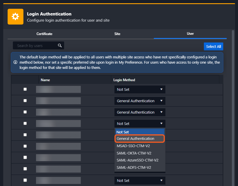 If no specific sites or users were configured with a login authentication method, simply change the default login method to General Authentication, then click the Save button. All users will be switched to general authentication by this action.