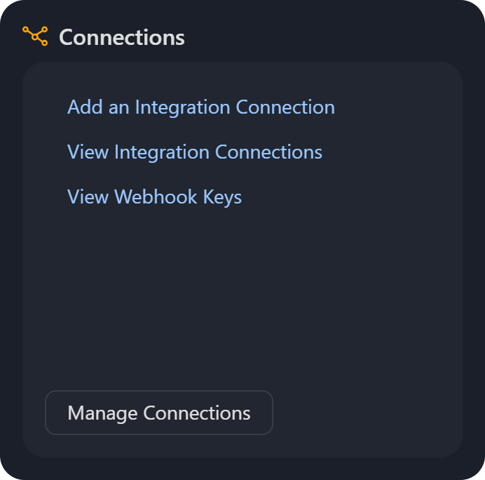 Connections: The Add an Integration Connection and View Integration Connections links redirect users to the Integration Connections tab in the Connections module. The View Webhook Keys link takes users to the Webhook Keys tab.