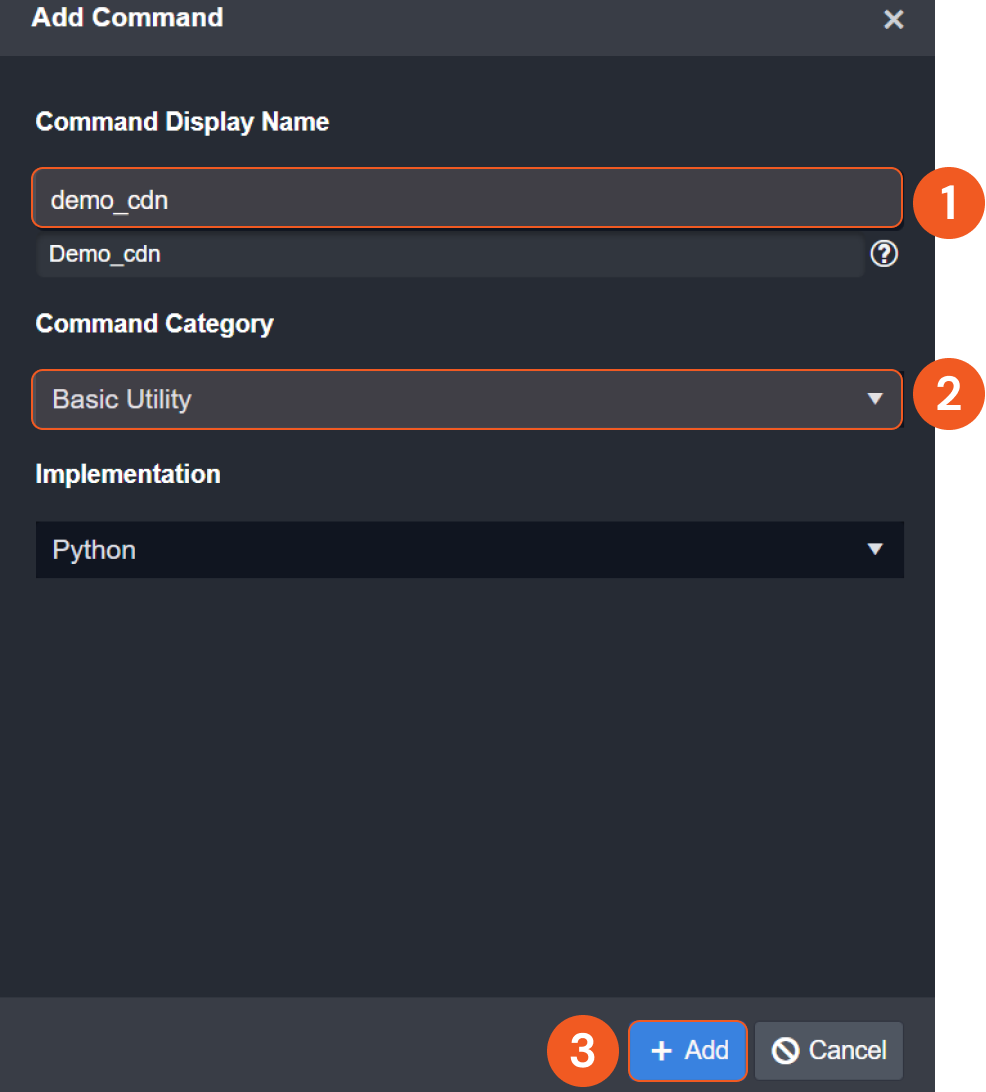 Click on the dropdown of the Implementation section in the Add Command popup. Notice that, by default, there exists two initial implementation options: